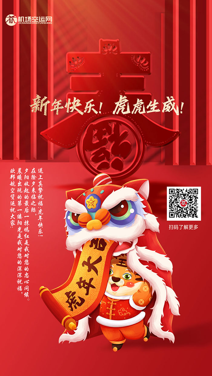 晨曦出现的第一缕阳光是我对您的深深祝福,夕阳下最后一抹嫣红是我对您的忠心问候,欧邦航空货运在新年来临之际祝福您:好运连连,虎虎生威,万事如意!