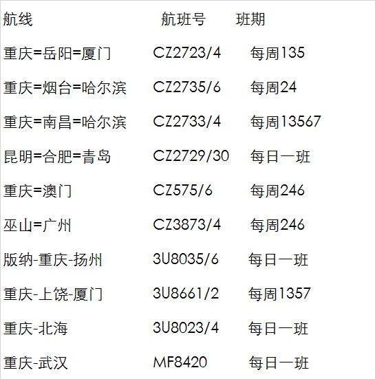 全国民航将迎来冬春航班换季。新航季中,南航系将进一步加大在渝的运力投放,优化航班时刻,在重庆地区新开10条国内航线,为旅客出行、航空货运提供了更多便利。